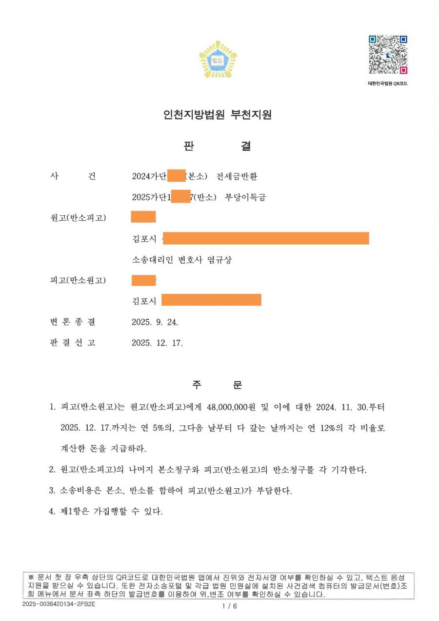 (민사) 전세보증금반환 소송 전부승소 판결 (부천지원 2024가단****)