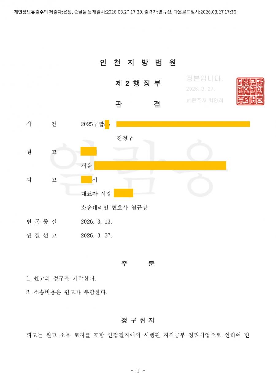 나. 재판부는 이 사건 청구에 대하여 소의 이익은 있으나 지적재조사법에 따라 원고가 위 법에 따른 경계결정에 대하여 이의가 없어 경계가 확정되었기에 그 위법함을 전제로 한 이 사건 청구는 이유 없다면서 염규상 변호사의 주장을 받아들여 원고 청구를 기각하였습니다.